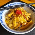 Das Öl in einer Wokpfanne erhitzen, Schweinefleisch kurz scharf braten. Danach aus der Pfanne geben. Mit den Röstrückständen und 3/8 Wasser mit der Knorr Chinapfanne kurz aufkochen.